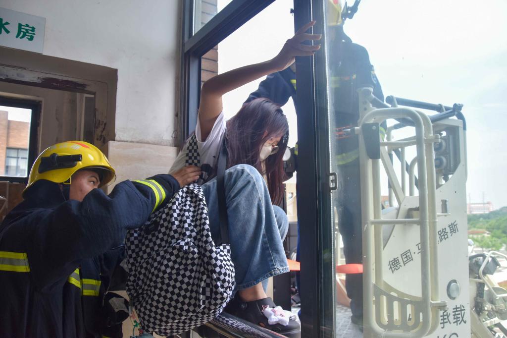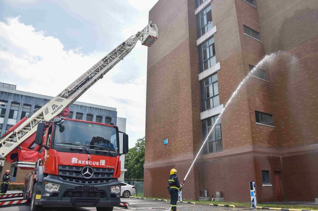 演习正式开始,按预定计划进行了公寓模拟失火,触发消防警报和应急响应预案,楼内师生组织应急疏散。随着警报声响起,消防部门接到求助后,消防车进校开展水炮灭火、步高空救援、火灾现场被困人员搜救等救援行动。经过全体参演人员的不懈努力,“火势”被完全扑灭,5层楼道内3名被困员工被云梯车安全救援疏散到地面,达到了预期效果。